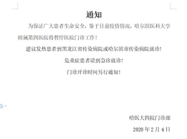 最新 哈尔滨医科大学附属第四医院将暂停医院门诊工作 哈尔滨医科大学 门诊 新浪新闻