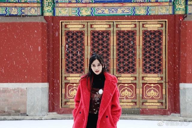 Angelababy大红的毛绒大衣加上故宫美景 构成一副绝美的
